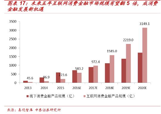 互联网消费金融从2013年开始到2017年,规模从60亿元增长到了4 367.1亿元,年均复合增长率达到了317.5%。互联网消费金融将迎来爆发式增长,推动全国金融业向互联网发展。
