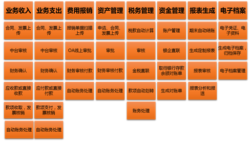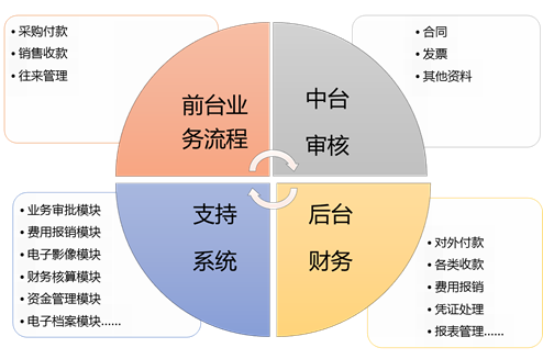 后台:主要由财务部门组成,负责采购付款、报销付款,销售发票开具、财务处理、各类报表生成等。