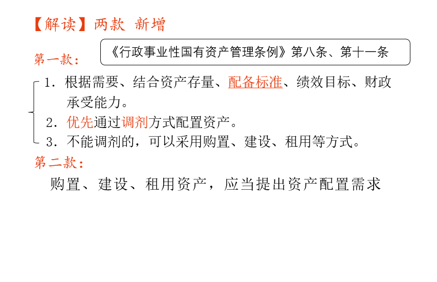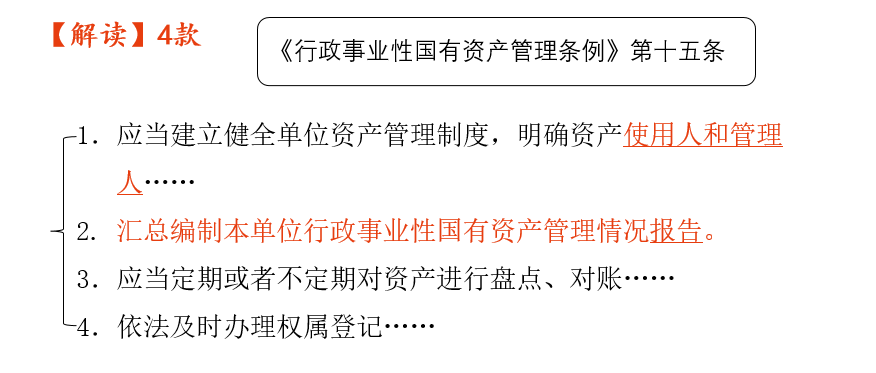 三是,衔接国有资产管理新要求,按照《行政事业性国有资产管理条例》等规定,增加设置国有资产台账、定期盘点资产、及时办理资产权属登记等内容。